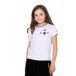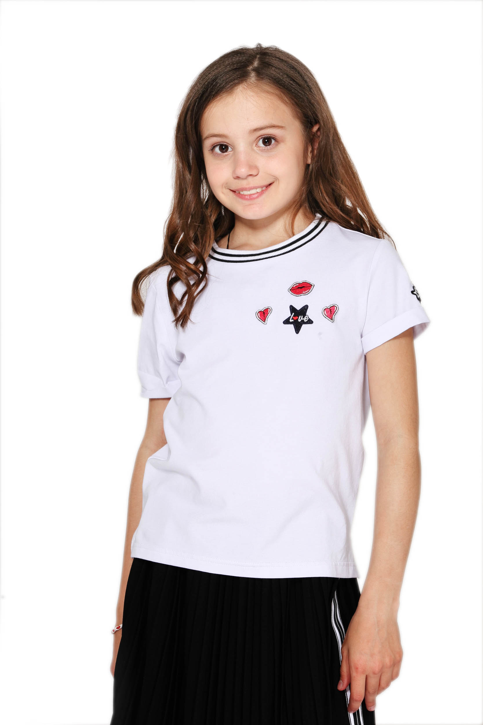 Стильная трикотажная футболка Lukas 9238 из новой коллекции. Белая футболка для девочки с коротким рукавом декорирована модными аппликациями. Отличная альтернатива школьной блузке с коротким рукавом.