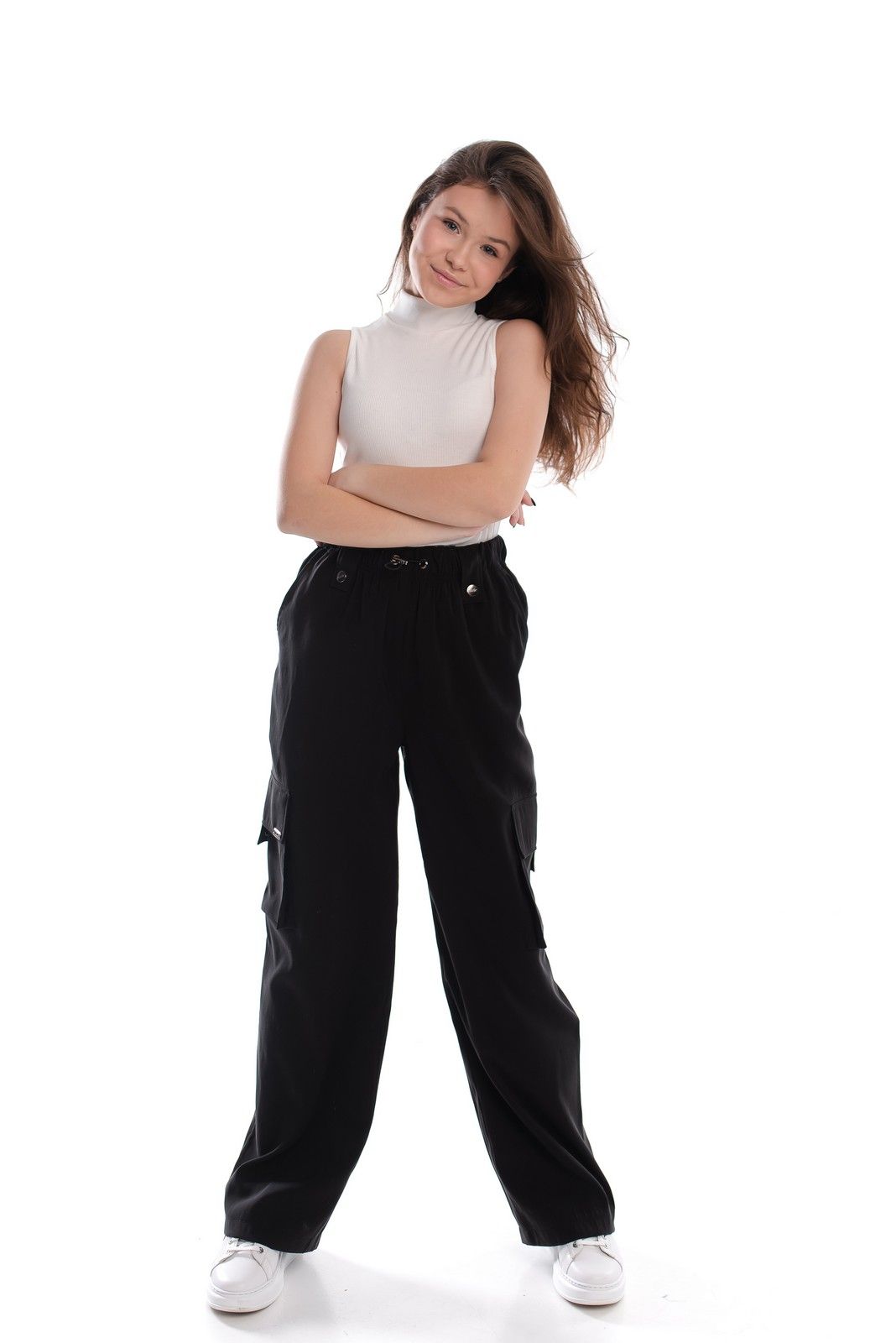 Штани "Зара" прямого силуету повсякденного призначення, виконані з парашутного шовку. Пояс на резинці, з настрочними шльовками закріпленими кнопками. Додатково пояс регуюється шнур-резинкою з фіксатором. Збоку, на рівні коліна є обємні накладні кишені з клапаном оздобленим патою та кнопкою. На задній правій половинці розміщена нефункціональна кишеня з листочкою. Низ штанів оздоблено широкою строчкою.