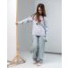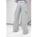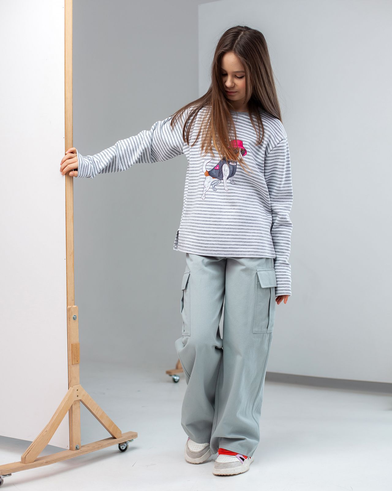 Брюки прямого силуету повсякденного призначення, виконані з джинсової тканини. Застібка центральна на тасьму-блискавку і ґудзик. Пояс пришивний, ззаду на резинці. Передні частини з бічними навскісними кишенями та односторонніми складками. По боках, на рівні колін є накладні фігурні кишені з фігурним клапаном