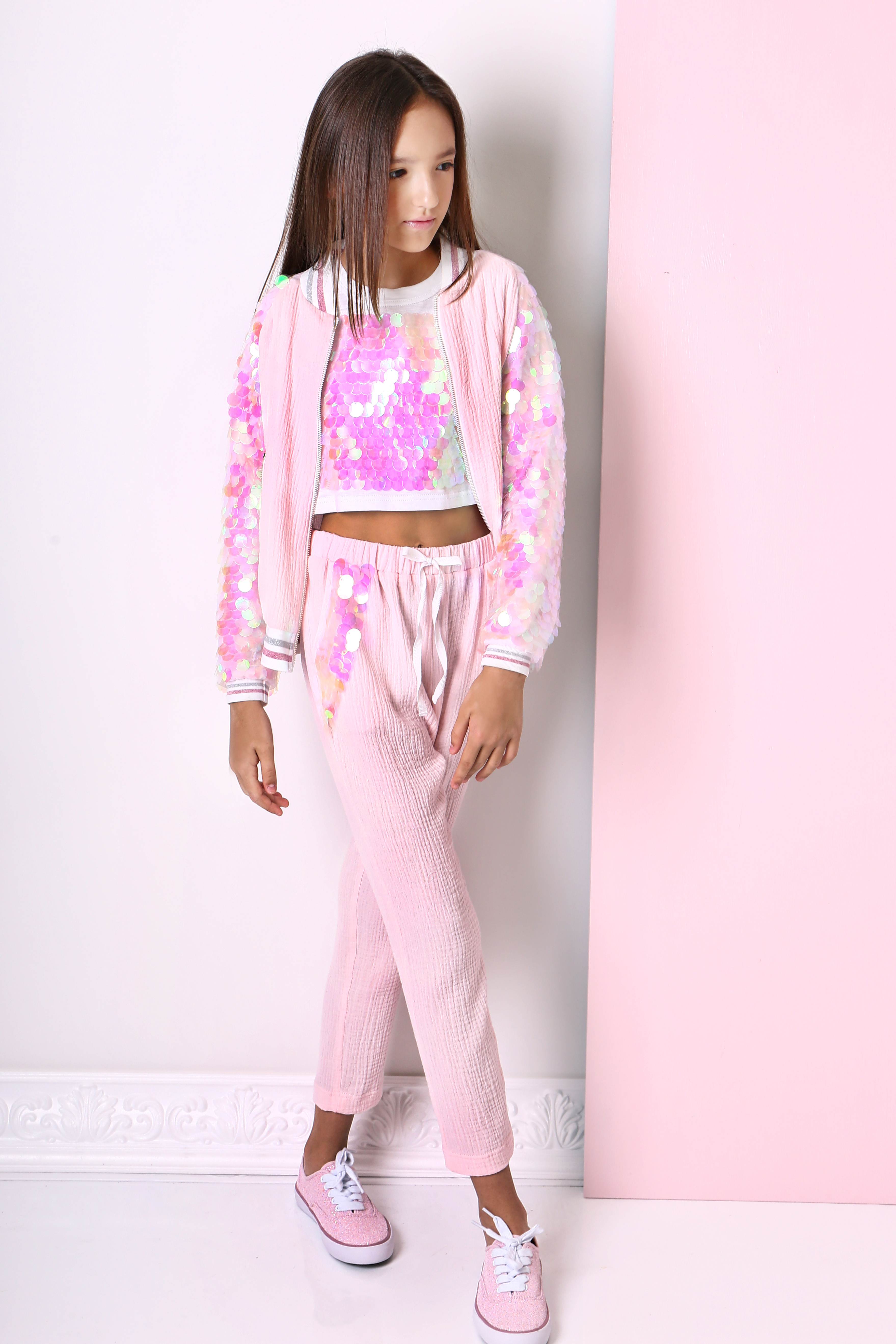 Стильные школьные брючки MONE 1894-1 цвета лотос. Декорированные крупными пайетками.