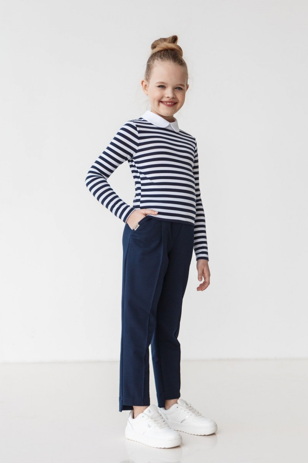 Трикотажные брюки для девочки из новой школьной коллекции Сьюзи. Брюки для повседневной носки. Пояс на тесьме-резинке обеспечивает удобную посадку. Карманы с отрезным бочком. От пояса отходят складки, застроченные защипами. Низ брюк асимметричный: удлиненный сзади на 2 см. Такое решение отличает модель среди других и добавляет оригинальности.