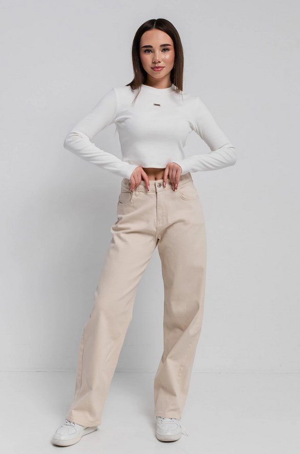 «Джен» прямого силуету з легкою вільною посадкою, що забезпечує комфорт протягом усього дня. Виріб має класичну застібку на блискавку та ґудзик, спереду і ззаду – функціональні кишені. Висока посадка вигідно підкреслює лінію талії та робить образ стильним і сучасним.