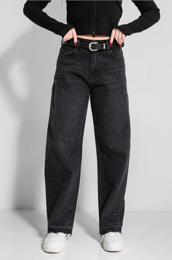 Передні класичні кишені з відрізним бочком доповнені густим розсипом мерехтливих стразів, які додають образу акцентності та характеру. Ззаду — накладні кишені та фігурна кокетка, що формує кращу посадку по фігурі. Необроблений