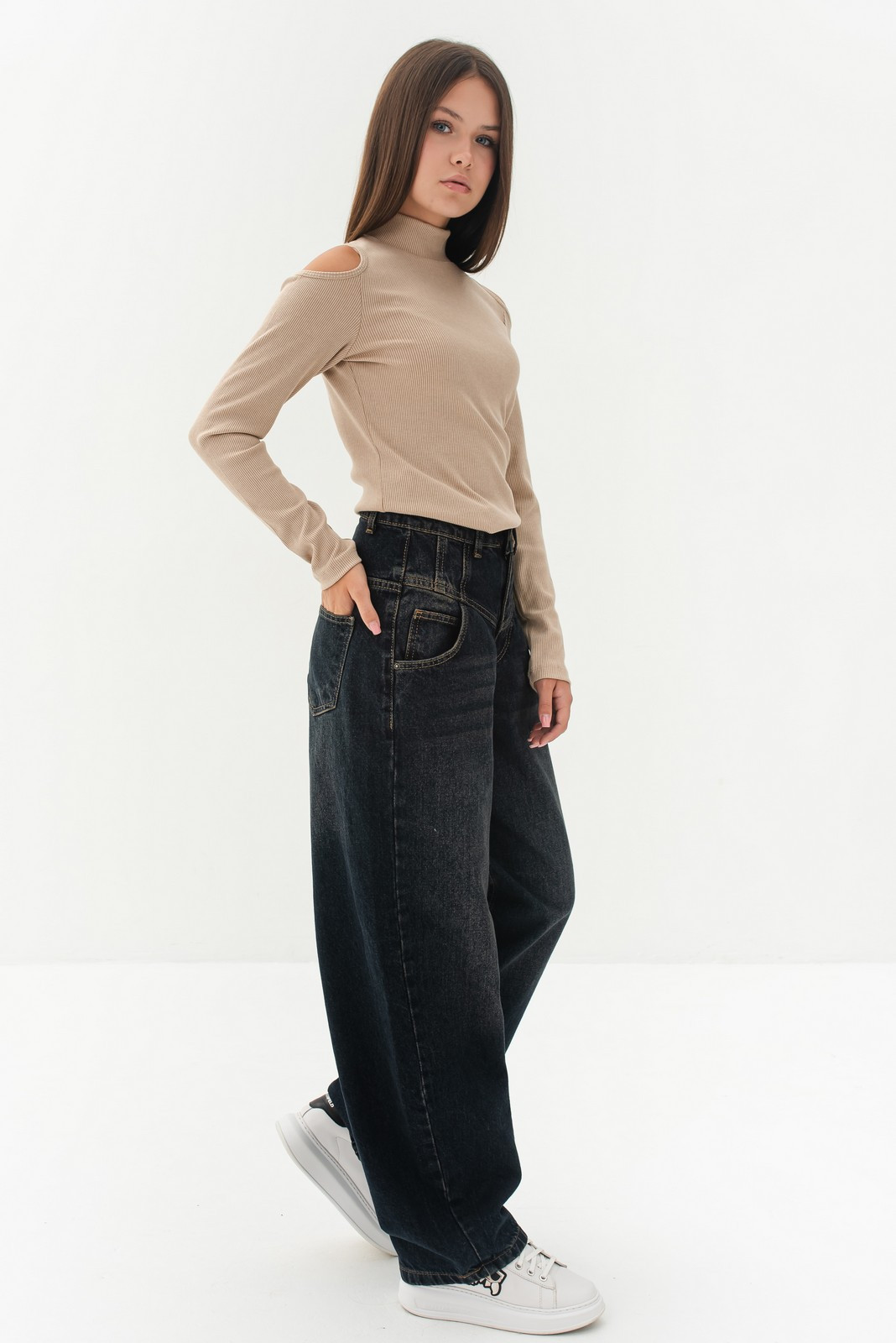 «Делайн» напівприлеглого силуету, висока посадка. На передніх частинах джинсів є кишені. Акцентом є виточка трикутного вигляду ззаду, яка чудово підкреслює силует!