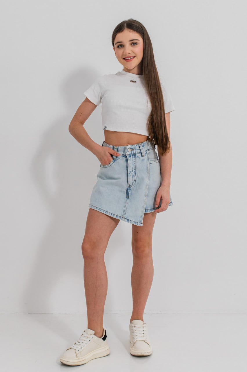 Спідниця-шорти «Арабель» виконана з щільного джинсу. Спереду має акцентну асиметричну імітацію спідниці. Модель з кишенями та кроєм, який приковує погляди.
