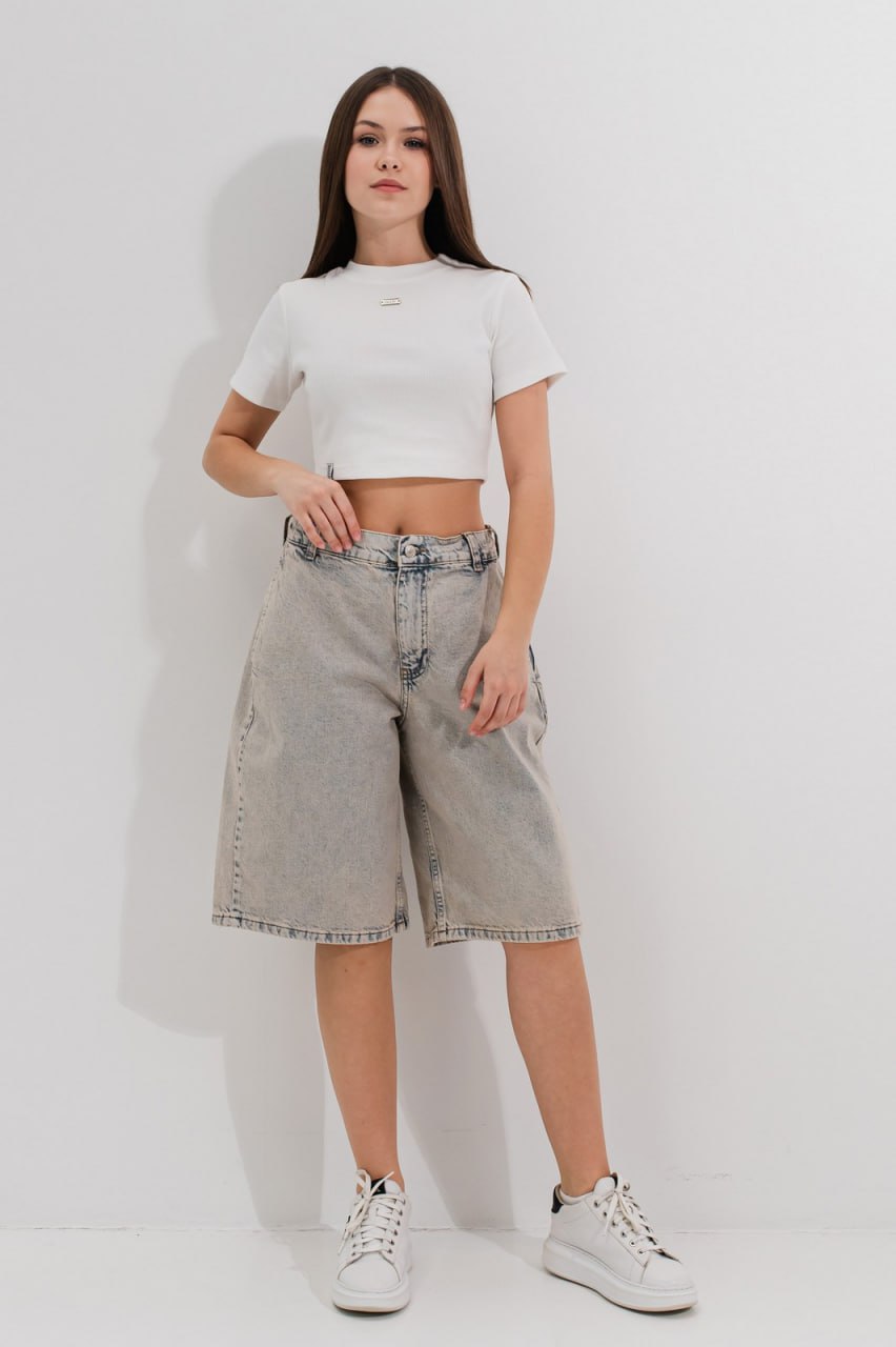 Шорти «Енні» розширеного до низу силуету довжиною нижче коліна. Спереду та ззаду має по дві функціональні кишені. Має вшиту резинку-утяжку в поясі. Джинсова тканина має стильні декоративні потертості, що додає моделі трендовості.