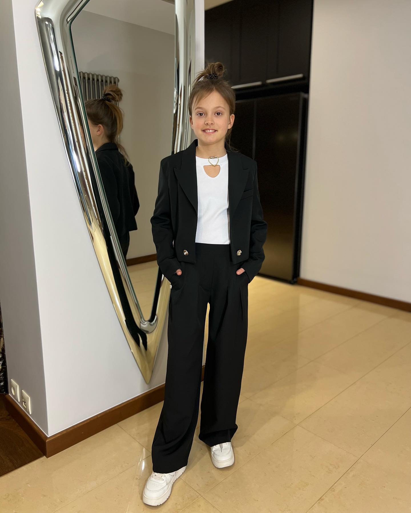 Стильний костюм для дівчинки від польского виробника Anbor. У комплект входить короткий жакет вільного крою, прикрашений гудзиками золотистого кольору та широкі штани-палаццо на комфортній широкій резинці-поясі. Є 2 врізні бічні кишені. Чудово поєднуються з футболкою даного виробника з нової весняно-літньої колекції.