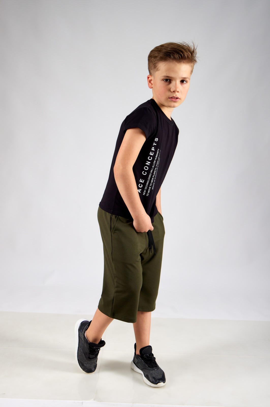 Чорна футболка для хлопців з нової літньої колекції Tair Kids. Якісна тканина. Декорована стильним принтом. Чудово поєднується з шортами цього ж виробника, які представлені на моделі.