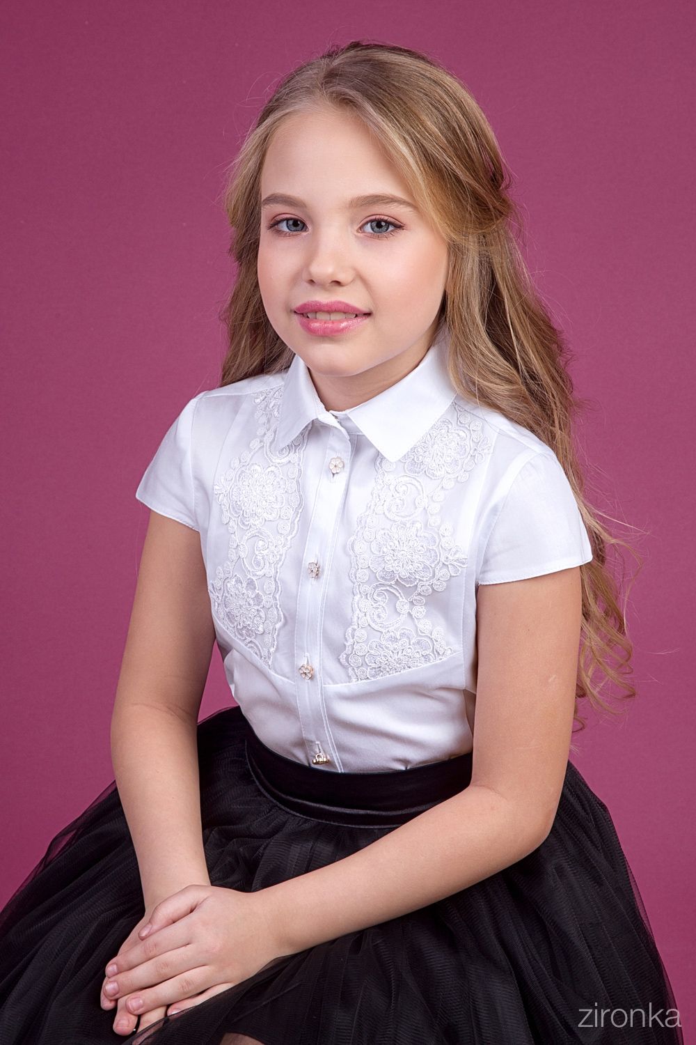 Хлопковая блузка ТМ Зиронька "Zironka" из новой школьной коллекции Textile Ajour 2019 года. Нарядная блузка-рубашка с коротким рукавом и отложным воротником. Полочка изделия декорирована готовыми кружевными аппликациями. Выполнена из нежной ткани, мягкой и приятной на ощупь. Тонкая, но при этом не просвещается и не блестит. Застегивается на пуговицы.