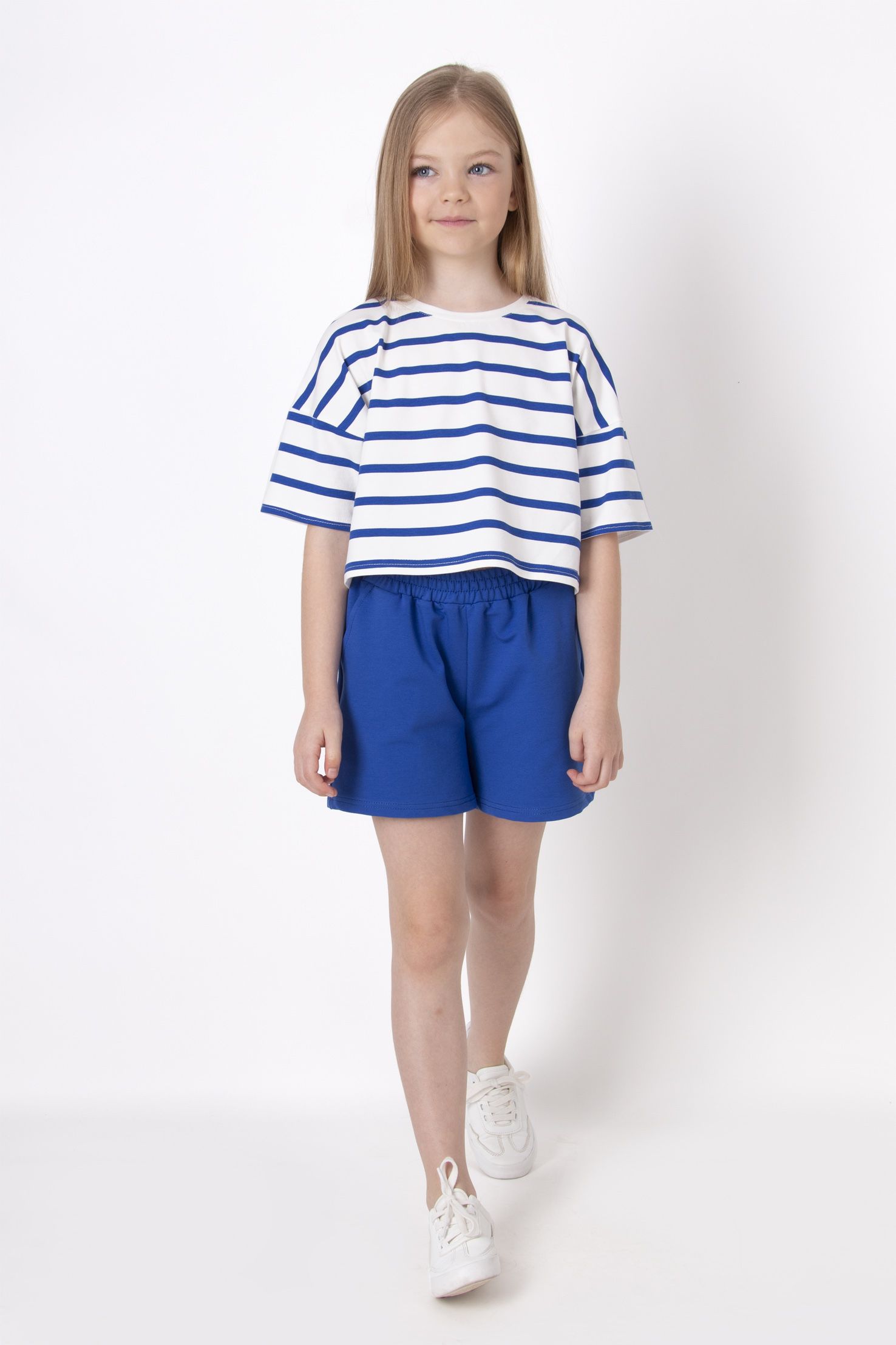 Літній костюм з шортами Mevis 4655/4656 з нової літньої колекції. Cмугаста футболка вільного крою зі спущеним плечем.