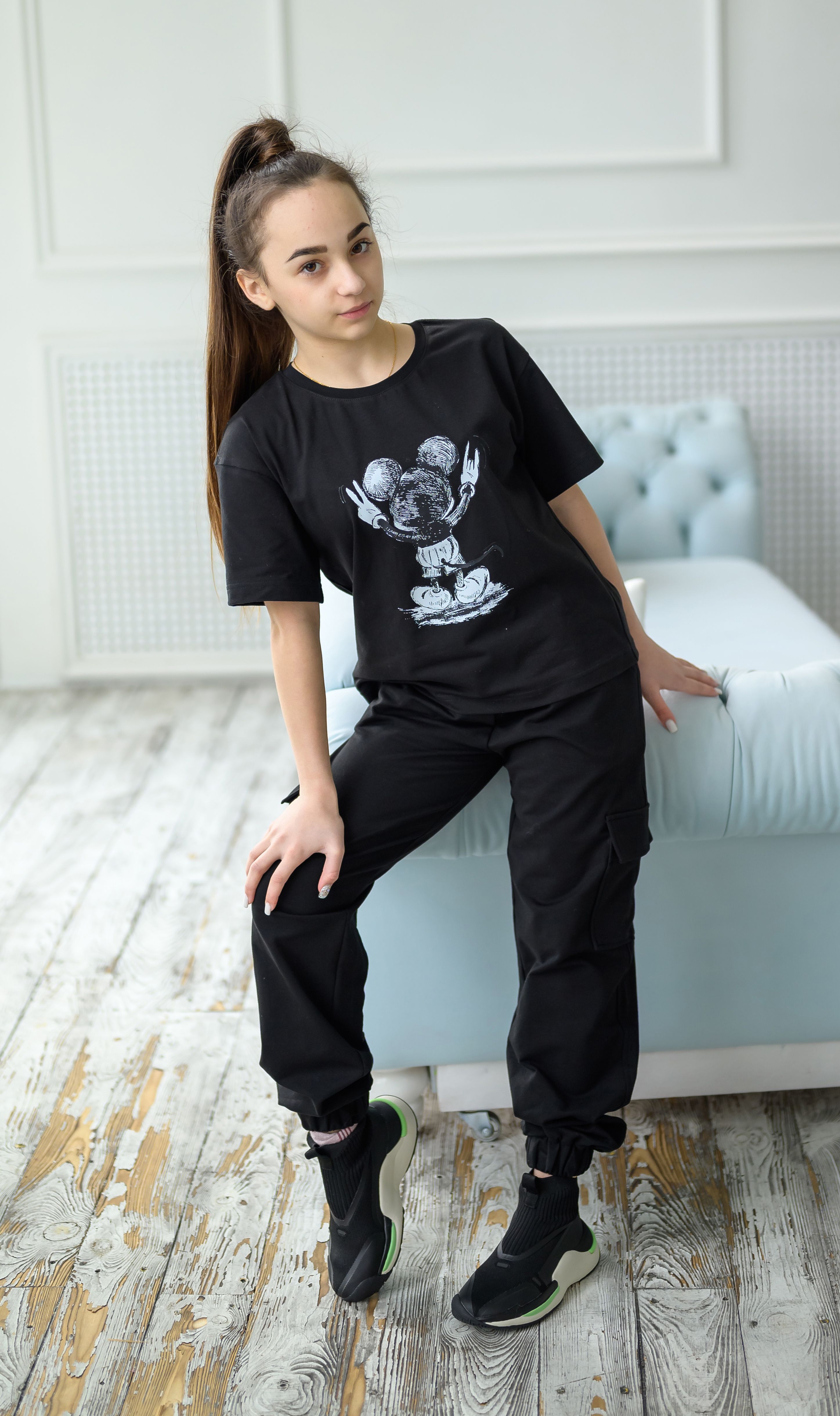 Футболка-oversize для дівчинки Filatova, колір чорний. Якісна тканина та пошив. Базова річ, на яку можно нанесений принт - Міккі. Короткий рукав, спущена лінія плеча, футболка має вільний фасон. Обов`язково сподобається дівчаткам. Чудово поєднується із трикотажними шортами цього ж виробника.
