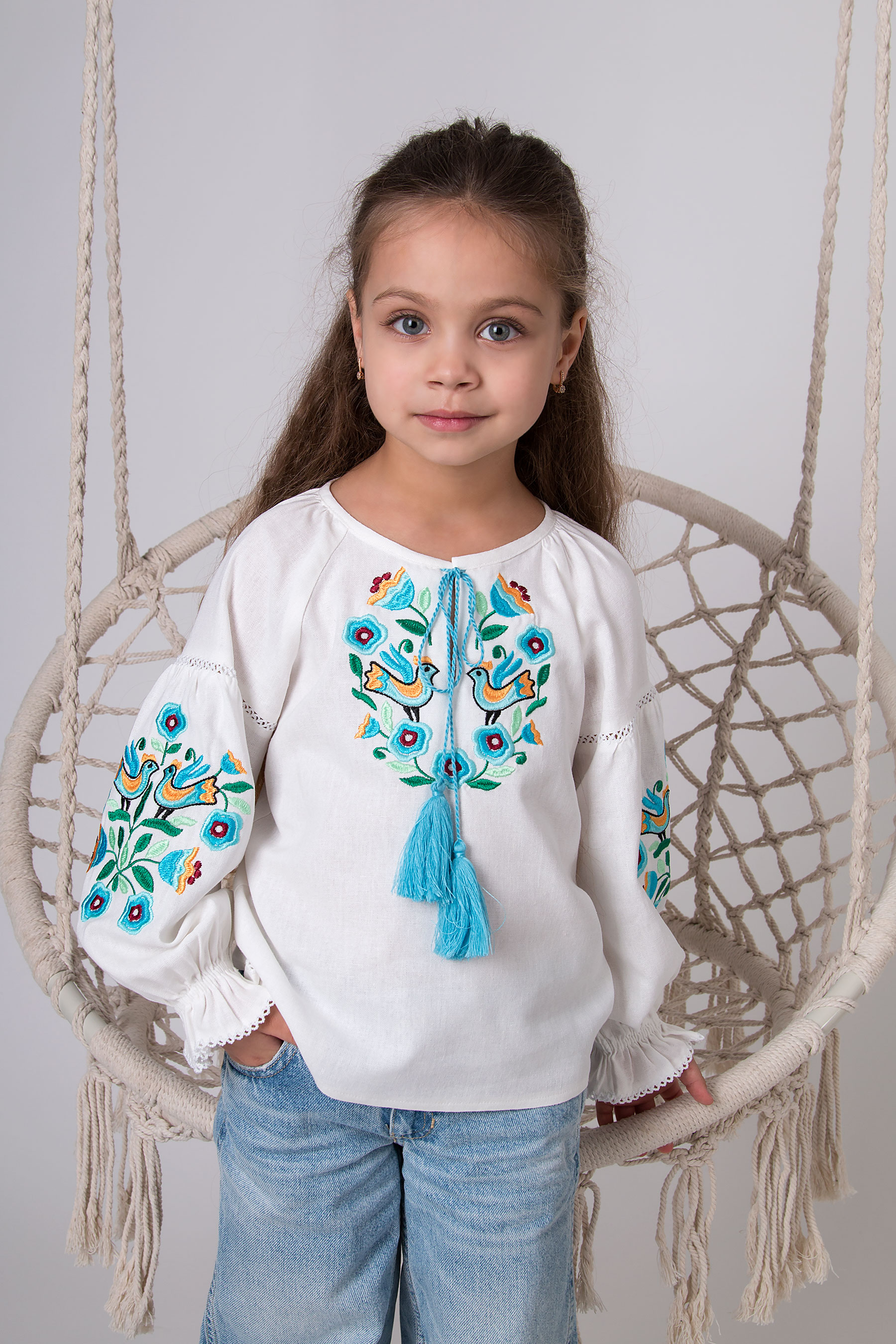 Лляна вишиванка для дівчат Mevis 5285-01, колір білий. Дуже гарна вишивана блузка для дівчат молодшого та середнього шкільного віку виготовлена лляного полотна високої якості. Завдяки, домішкам поліестера, тканина краще зберігає зовнішний вигляд, ніж 100% льон.