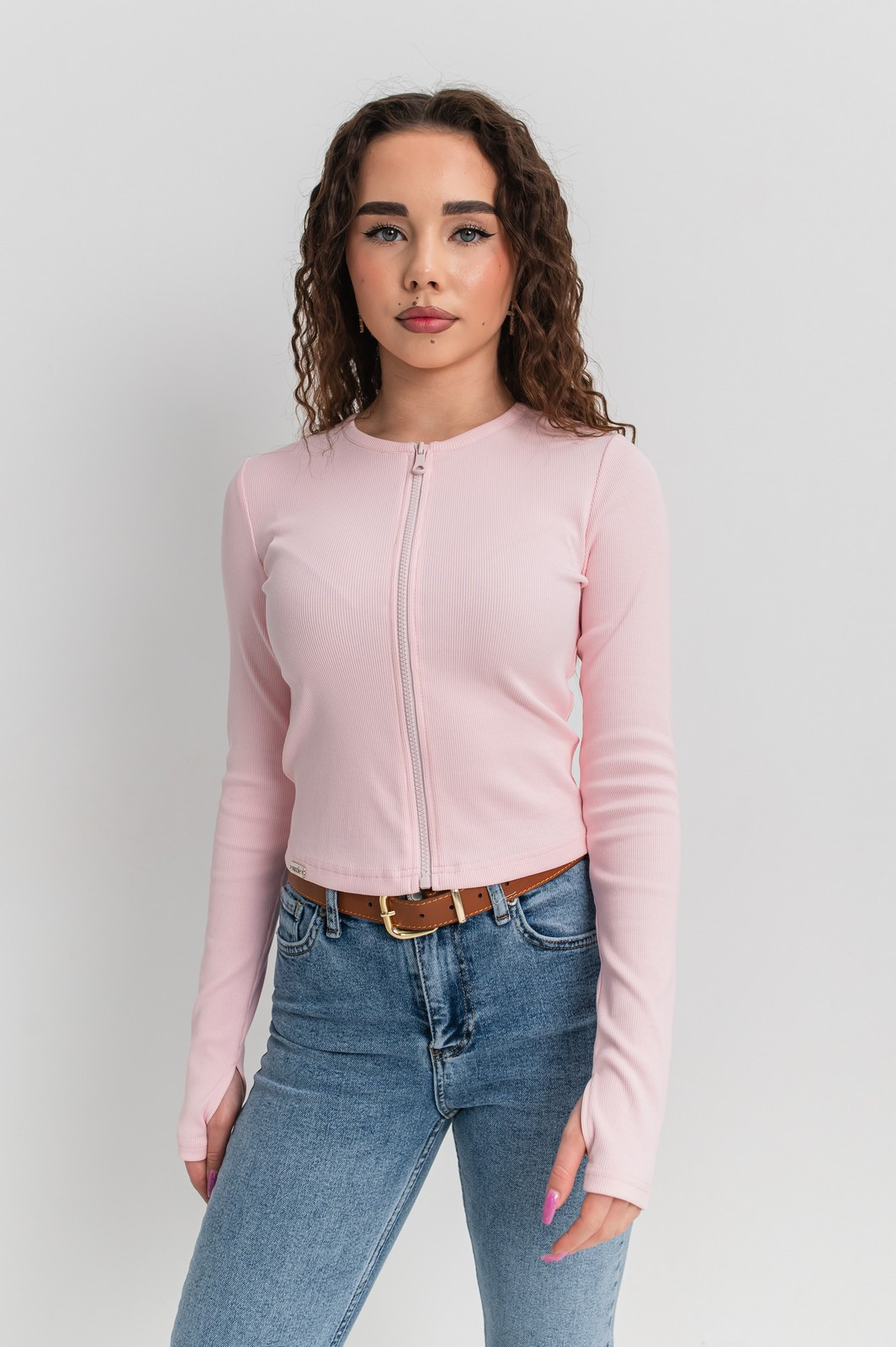 «Леяна» прилеглого силуету, що підкреслює фігуру, довжиною нижче лінії талії. Рукав вшивний, довгий з отвором для великого пальця додають образу сучасного акценту й комфорту в щоденному ритмі. Центральна застібка на блискавку дозволяє змінювати настрій образу — носити лонгслів більш закрито або акцентувати лінію декольте.