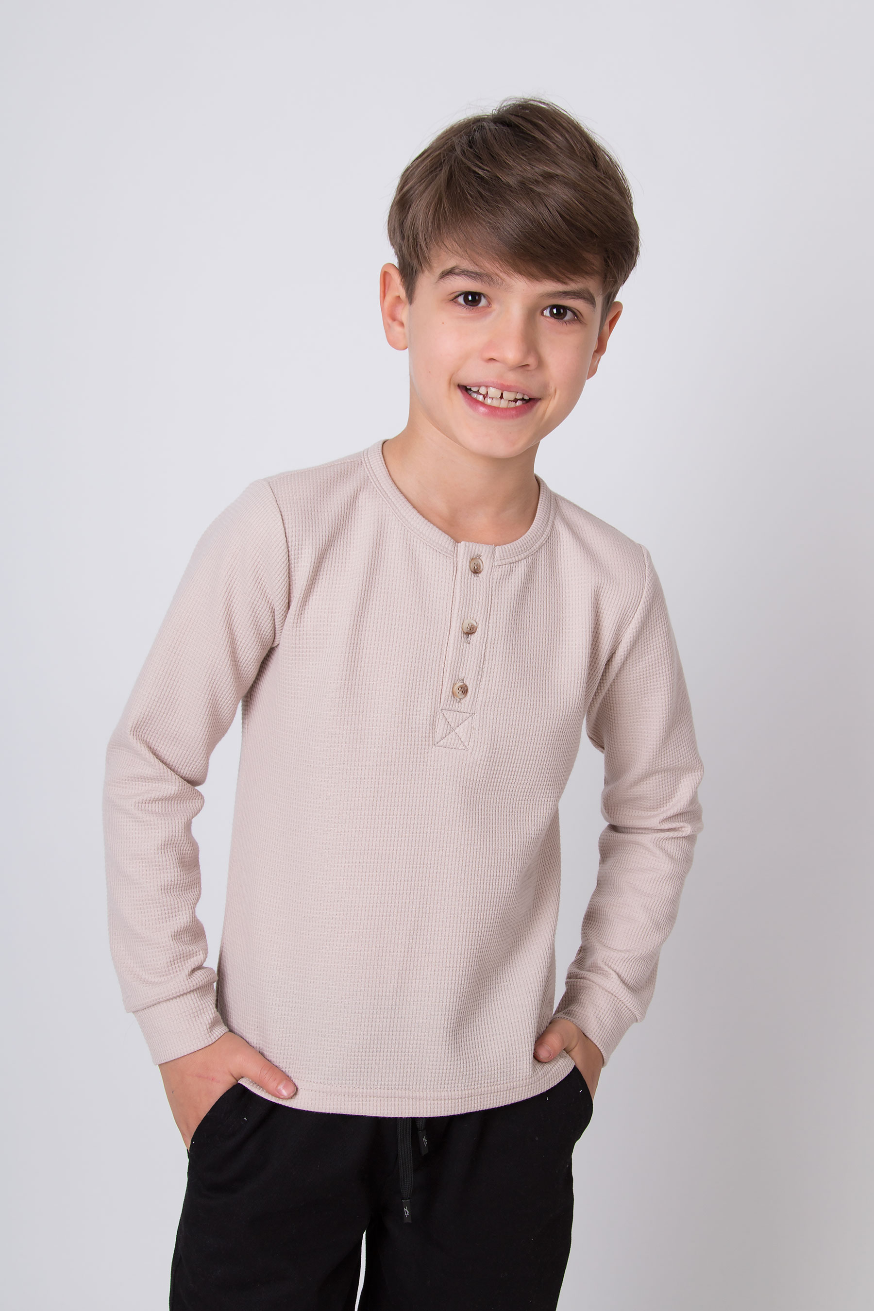 Лонгслів для хлопців Mevis 5648-05, колір бежевий. Лонгслів для хлопчика з довгим рукавом і круглою горловиною. Модель доповнена планкою з ґудзиками, виконана з м’якої фактурної тканини.