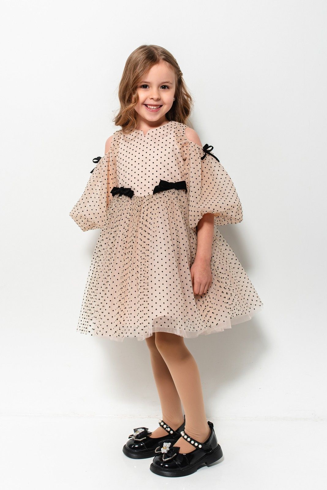 З євротюлі в горошок, напівприлеглого силуету відрізна по лінії талії, довжиною до коліна.