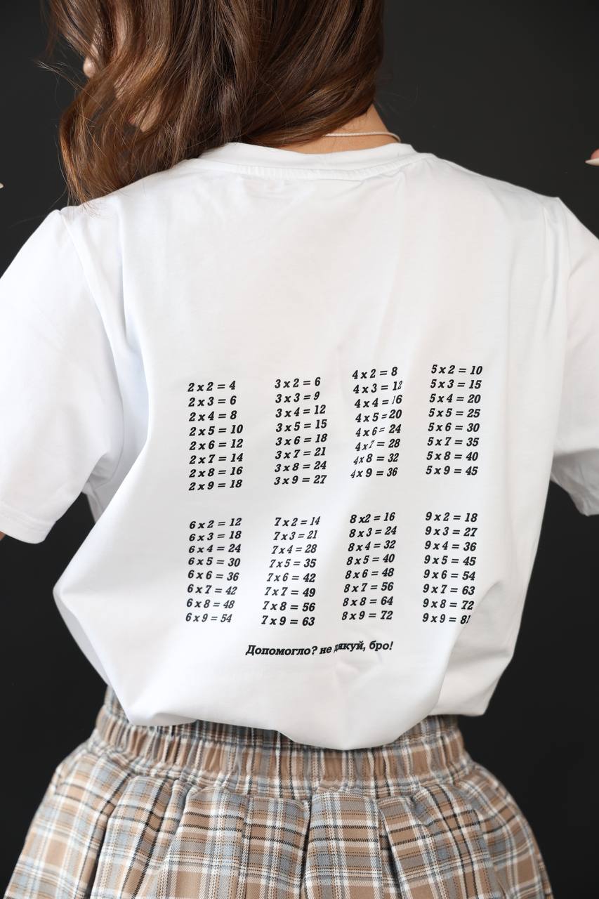 Шкільна футболка Arisweet Табличка множення, колір білий. Базова річ для хлопців і дівчат. Короткий рукав, спущена лінія плеча, футболка має вільний фасон.
