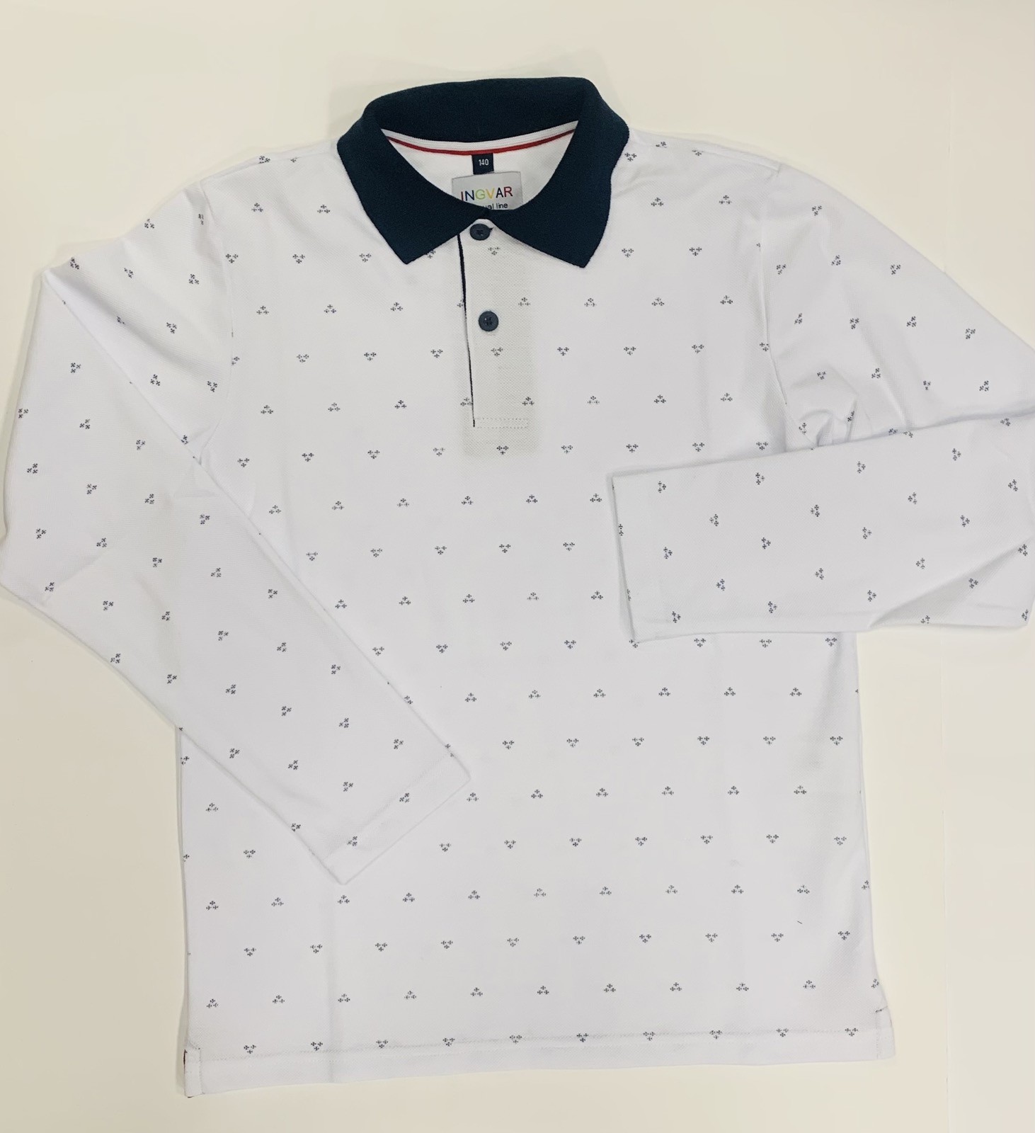 Біла класична футболка-поло для хлопчика із нової шкільної колекції Ingvar 2025 року. Виріб легко поєднується з повсякденним та спортивним одягом. Модель із довгими рукавами створена з бавовняної тканини Лакоста. Рукави та комір оздоблені темно-синьою тканиною.
