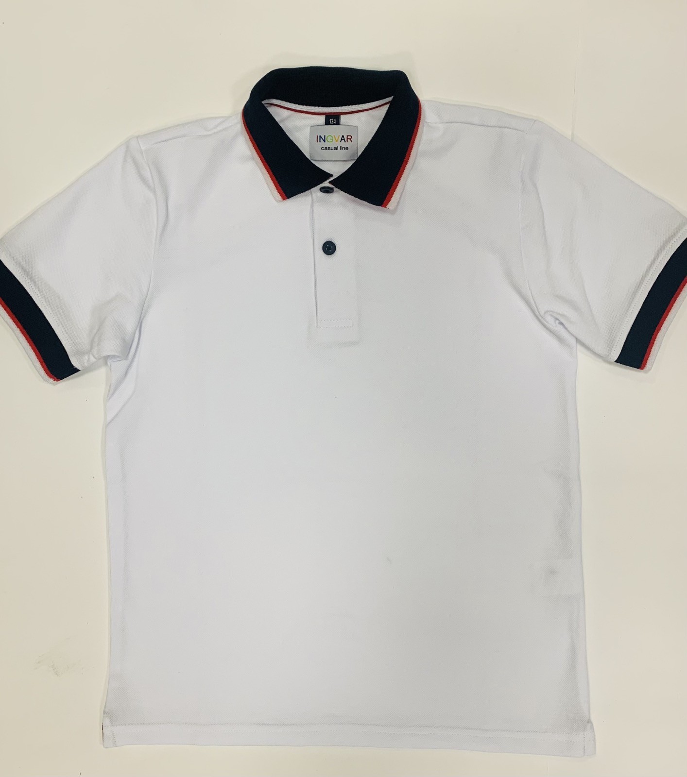 Біла класична футболка-поло для хлопчика із нової шкільної колекції Ingvar 2025 року. Виріб легко поєднується з повсякденним та спортивним одягом. Модель із короткими рукавами створена з бавовняної тканини Лакоста. Рукави та комір оздоблені темно-синьою тканиною.