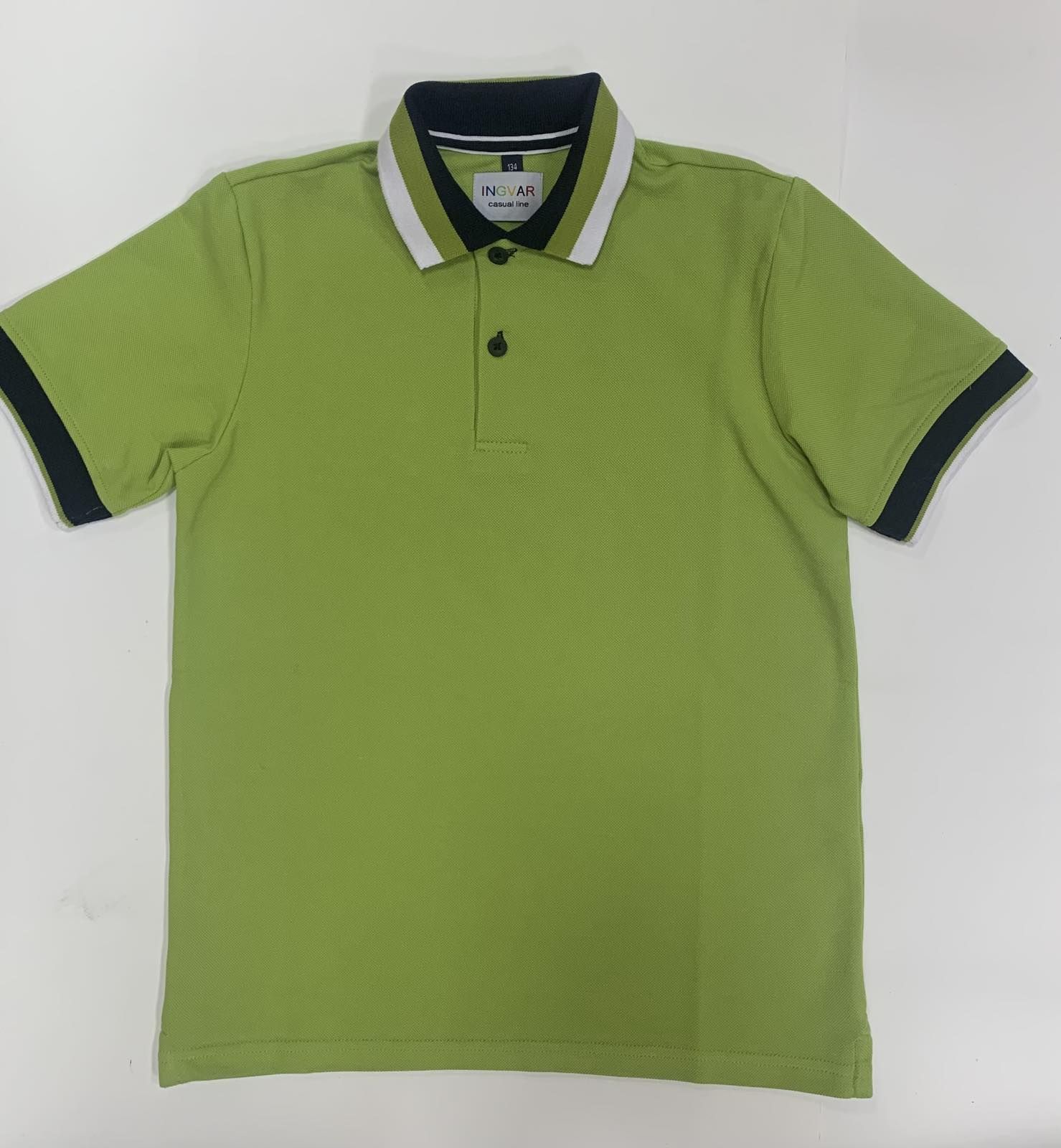 Зелена класична футболка-поло для хлопчика із нової шкільної колекції Ingvar 2025 року. Виріб легко поєднується з повсякденним та спортивним одягом. Модель із короткими рукавами створена з бавовняної тканини Лакоста. Рукави та комір оздоблені темно-синьою тканиною.