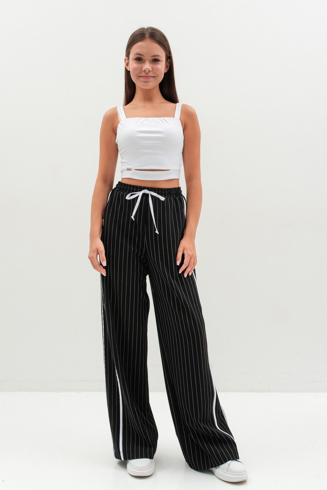 Брюки в смужку для дівчат Suzie Арлет LP114-Y4F01, колір чорний - це новинка виробника Сьюзі сезону 2024. Штани "Теодора" повсякденого призначення, прямого силуету. Пояс пришивний на резинці.