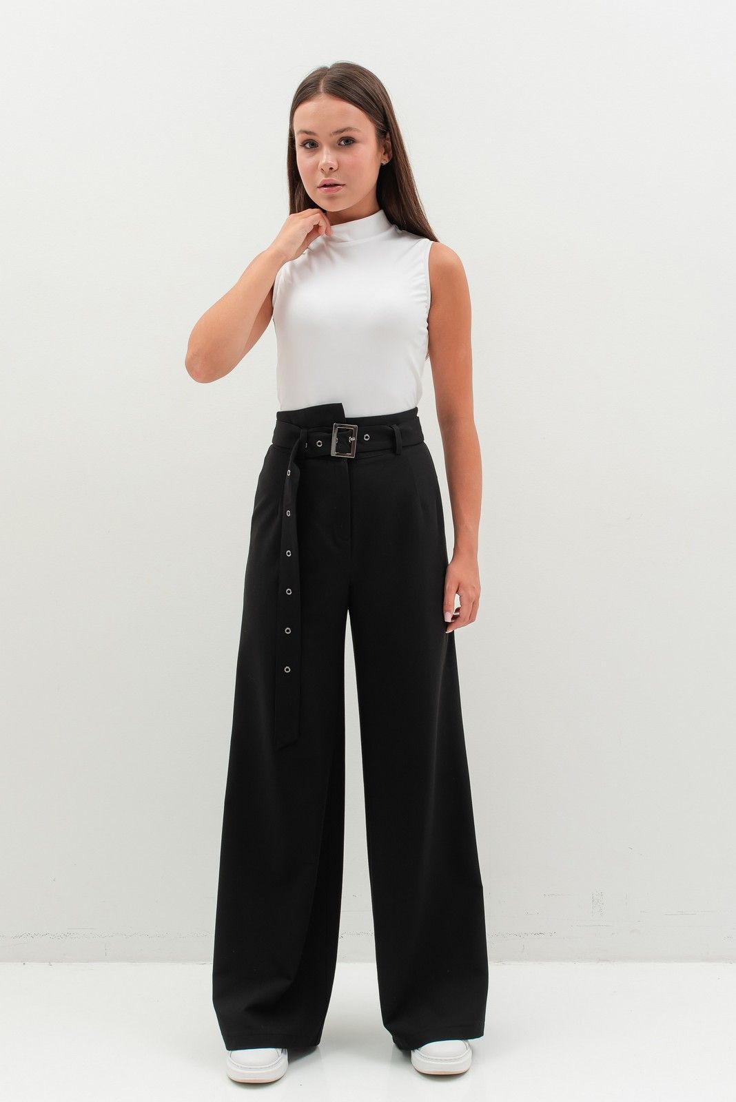 Справжньою ізюминкою є фігурний асиметричний верх штанів та пояс, що застібається на пряжку. Ззаду пояс на резинці для зручності.