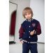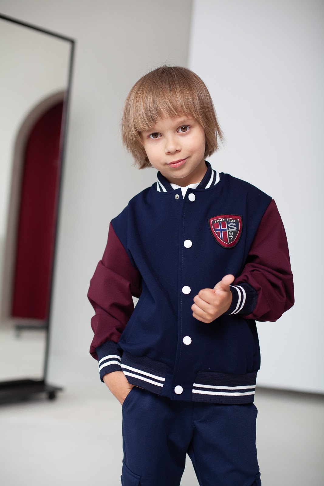 Стильний бомбер на кнопках, рукави та низ бомберу виконані з контрастної синьо-бордової резинки.