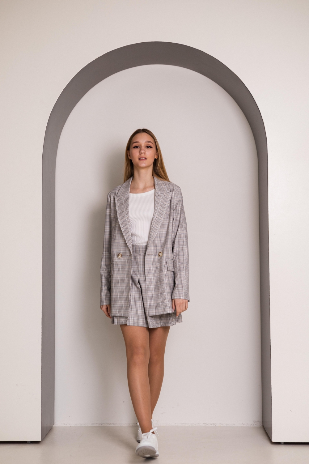 Стильний двубортний жакет для дівчини з нової школьної колекції Filatova. Дуже комфортна модель з костюмної тканини високої якості. Має два накладних кармани. Чудово поєднується з юбками, шортами та брючками.