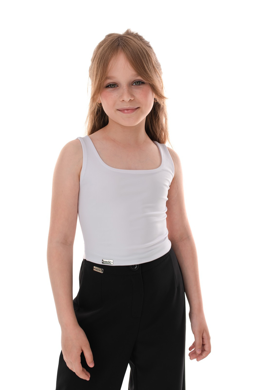 Топ на брителях. Передня половинка топа подвійна. Виріз горловини квадратний з скургленими кутами. Довжина вище лінії талії.