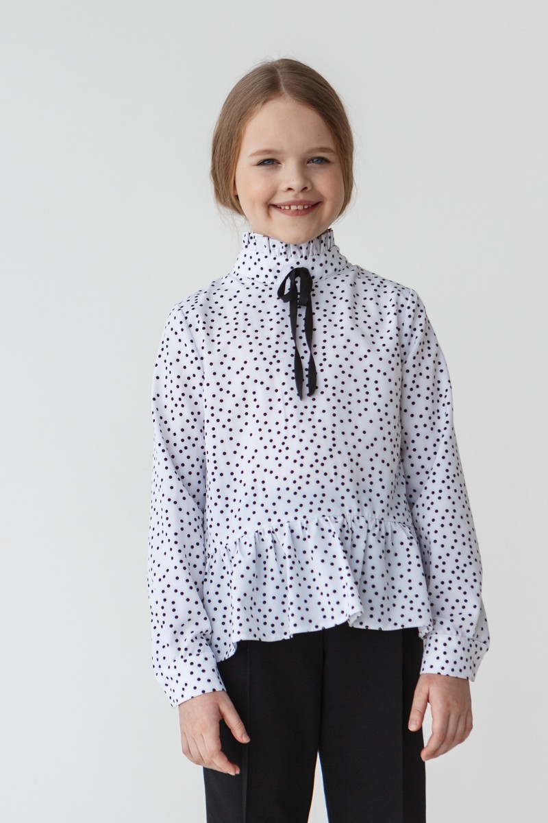 Изящная блузка для девочки из новой школьной коллекции Suzie сезона 2021. Оригинальная блузочка свободного силуэта с баской. Изделие с воротником-стойкой декорировано элегантным бантом.