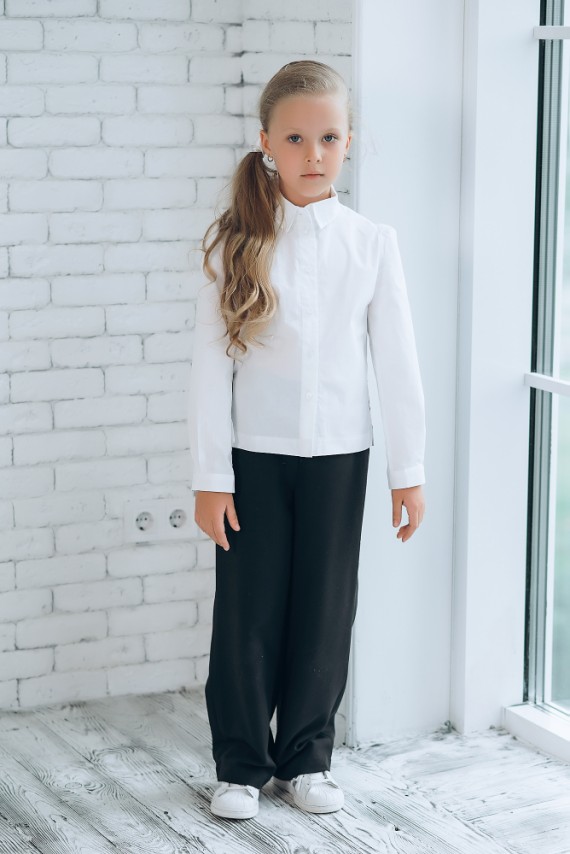 Классическая белая рубашка для девочки от дизайнера Татяны Филатовой из новой школьной коллекции. Полуприлегающий крой, длинный рукав, спущенная линия плеча. Рубашка уместна и в школьные будни, и на торжества.