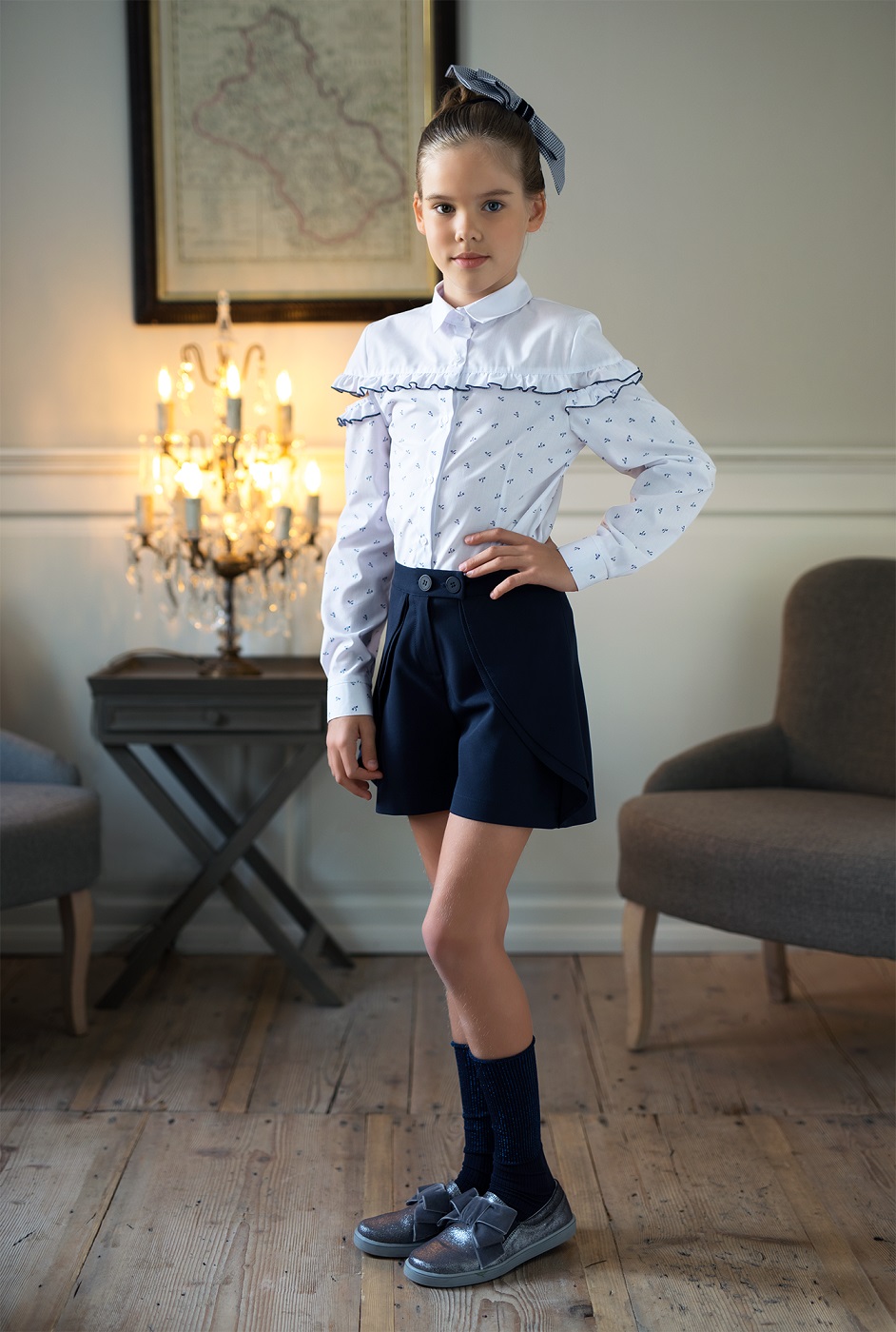 Школьная юбка-шорты Sly из новой школьной коллекции Слай 2019 года. Стильная школьная юбочка-шорты для девочки с драпировкой спереди. Отличается идеальными лекалами, стильным дизайном и высочайшим качеством пошива и тканей.