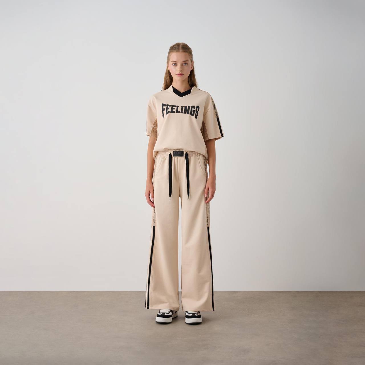 Спортивний костюм для дівчат Locoloco 7391, колір бежевий з нової весняно-літньої колекції 2025 року створений дарувати щастя. Футболка чудово поєднується із широкими брючками з тієї ж колекції.