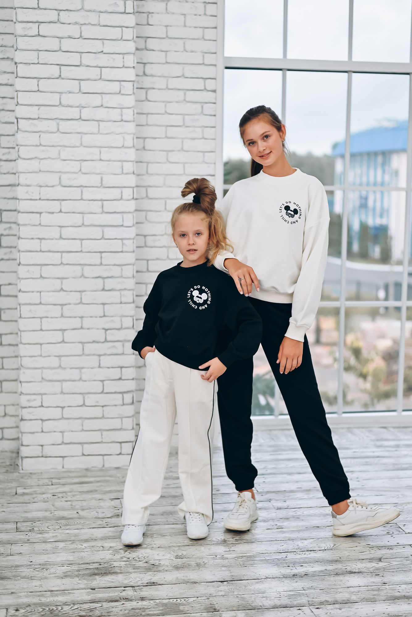 Стильный подростковый костюм для девочки в стиле "сити стайл" из новой коллекции ТМ Filatova. В комплект входит укороченный свитшот молочного цвета и широкие брюки-палаццо в черном цвете. Свитшот декорирован логотипом Микки в районе груди.
