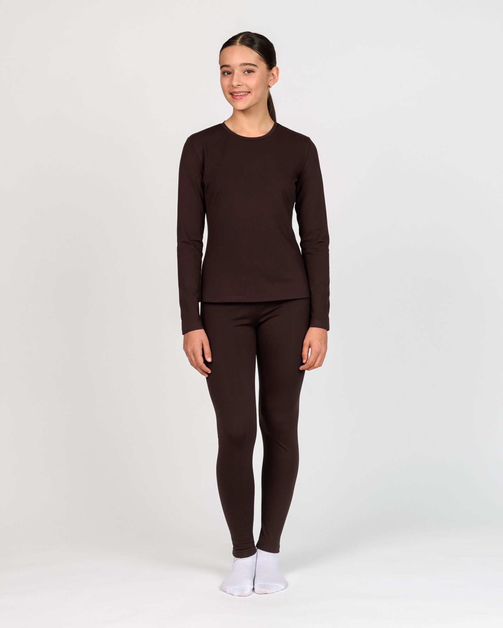 Лонгслів має класичний округлий виріз і довгі рукави, що робить його зручним для щоденного носіння. Легінси з комфортною посадкою на еластичному поясі забезпечують максимальний комфорт і легкість руху.