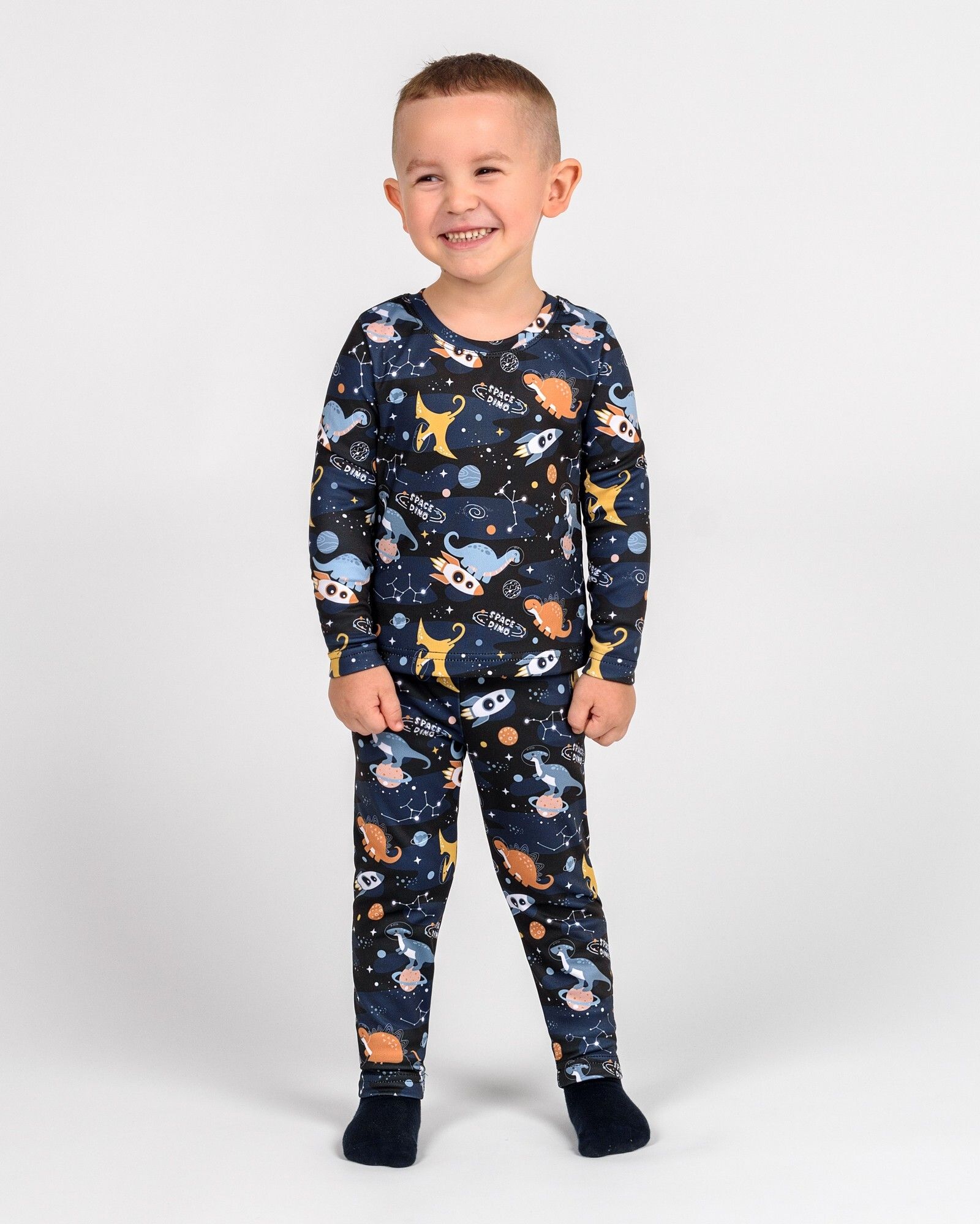 Термобілизна для хлопчика з яскравим принтом "Діно в космосі" в синіх кольорах – це не лише стильний, але й практичний вибір для прохолодної пори року. Комплект включає лонгслів та легінси, виготовлені з преміум-тканини термоначіс, яка ефективно зберігає тепло та відводить вологу, забезпечуючи максимальний комфорт під час носіння.