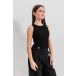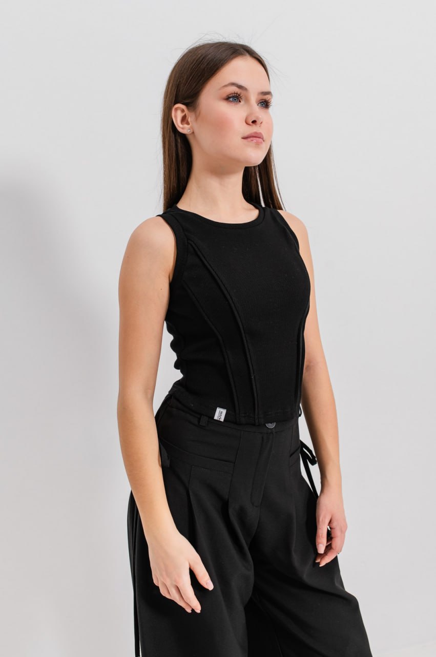 Топ на брителях. Передня половинка топа подвійна. Виріз горловини квадратний з скургленими кутами. Довжина вище лінії талії.