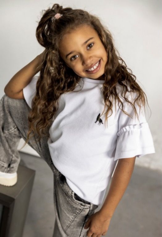 Гарна трикотажна блузка-топ з коротким рукавом для дівчат від польского бренду з нової весняної колекції. Облягаюча блуза з трикотажної тканини дуже зручна, рукава декоровані воланами.
