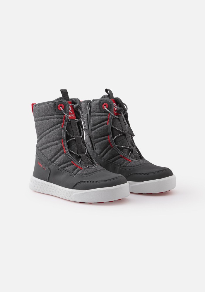 Зимові черевики Reimatec Hankinen 5400031A, колір 9700 з нової зимової колекції Рейма 2023-2024 для дітей та підлітків– практичне та надійне взуття для зимових забав! Завдяки водонепроникній конструкції та напіввовняній підкладці із запаяними швами ніжкам буде тепло та сухо у морозні зимові дні, так що веселі пригоди на свіжому повітрі можуть тривати хоч весь день! За рахунок еластичних шнурків черевики легко одягати та зручно регулювати! Малюнок Happy Fit на знімних повстяних устілках допоможе підібрати потрібний розмір або виміряти ніжку дитини, що швидко росте. Еластична гумова підошва забезпечить гарне зчеплення на слизькій поверхні та не дасть впасти під час зимових пригод.