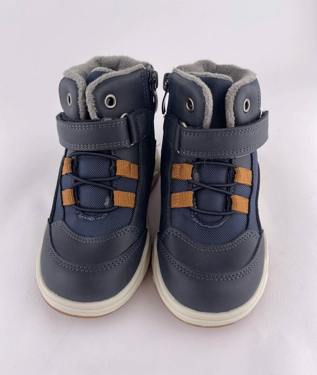 Стильні та теплі зимові черевики у насиченому синьому кольорі — ідеальний вибір для щоденних прогулянок у холодну пору. Виготовлені з якісного еко-шкіряного матеріалу, який легко очищується та захищає від вологи. Внутрішнє утеплення з м’якого хутра забезпечує комфорт і тепло. Зручна застібка на липучці у поєднанні з резинками дозволяє швидко взути взуття та добре зафіксувати його на ніжці. Бічна змійка додає ще більшої зручності при взуванні.Практичні, зручні та теплі — чудовий варіант для активної дитини.